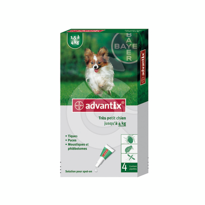 Solution cutanée antiparasitaire externe pour des chiens de 1,5 à 4 kg insecticide, acaricide et répulsive.
