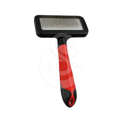Cette brosse carde enlève les vieux poils avec douceur. Les picots métalliques courbés brossent le poil jusqu’au sous-poil. De cette façon, on enlève également les pellicules et les noeuds.