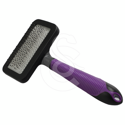 A picots métalliques souples et courbés, pour démêler le poil jusqu’au sous-poil et éliminer le vieux poil en douceur ainsi que les pellicules et les noeuds.