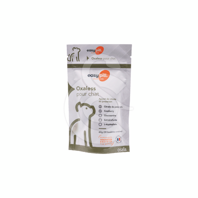 Easypill Chat Oxaless contribue à réduire la formation des calculs d’oxalate grâce à son apport en citrate de potassium qui permet d’alcaliniser les urines.