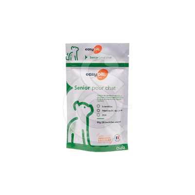 Easypill Chat Senior contient de la L-carnitine, des vitamines (B1, B6, C, PP) et du DHA (acide docosahexaénoïque) qui contribuent à l’amélioration de la qualité de vie du chat (tonicité, fonction cognitive).