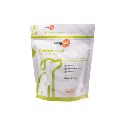 Easypill chien Confort rénal apporte du carbonate de calcium microencapsulé et du chitosan qui limitent l’absorption intestinale de phosphore et de dérivés azotés, ce qui soulage l’activité de filtration du rein.