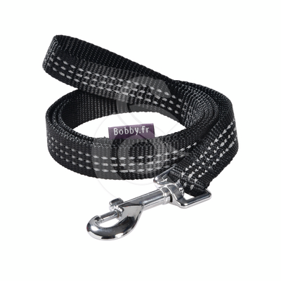 Laisse chien en nylon tressé surpiqué d’un point sellier réfléchissant permettant à votre chien d’être vu facilement.