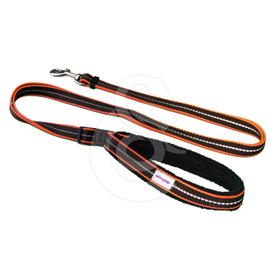 Laisse réglable pour chien, base noire avec une bande colorée et un liseré fluorescent.