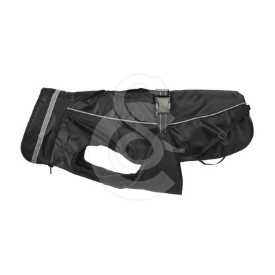 Fermeture du cou par zip, sous-ventrière ajustable par une sangle nylon à fermer autour de l’abdomen, plus 2 anses pour les pattes arrières afin d’obtenir un bon maintien. La bande réfléchissante rend le chien plus visible pendant les promenades nocturnes.