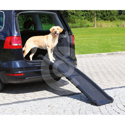 Cette rampe en plastique permet à un chien ayant des difficultés à se mouvoir, de monter ou descendre avec facilité d’un véhicule.